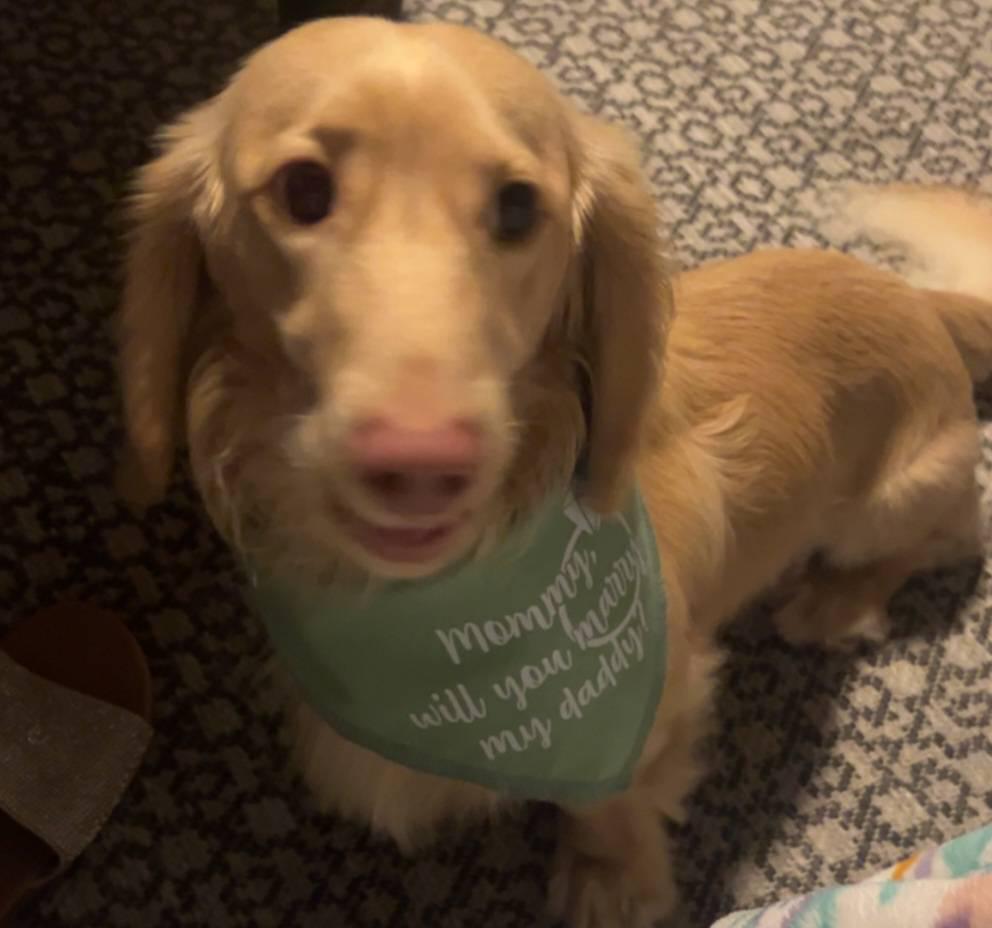 Ordered a bandana for my sons dog. My son proposed to his girlfriend. She said, yes! The bandana was really cute. The color was perfect. The shipping was fast. Thank you!